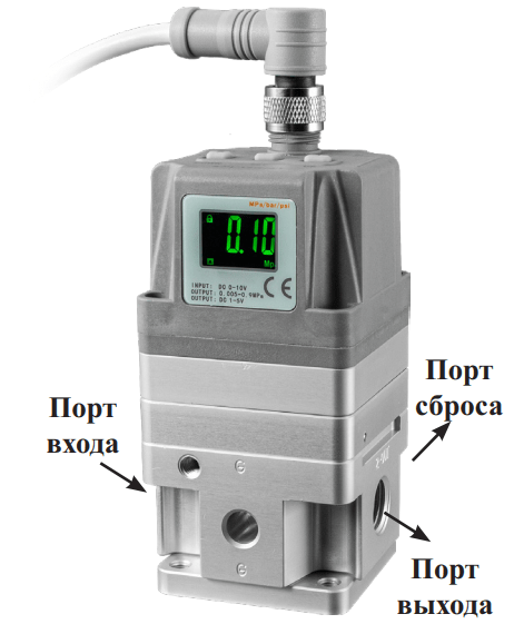 Цифровое табло индикации служит для отображения текущего давления, кода ошибки при неправильной работе регулятора, а также для контроля ввода параметров при его настройке. Для получения информации о текущем значении выходного давления используется находящийся в составе регулятора датчик давления. Значение выходного давления можно контролировать с помощью аналогового сигнала обратной связи в диапазоне =4...20 мА, =1...5 В или с помощью выходного сигнала NPN-типа.