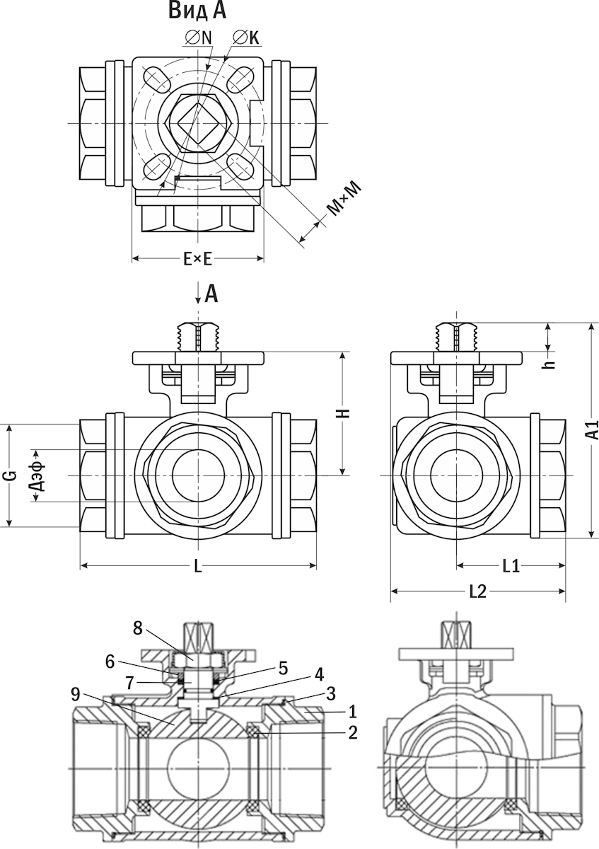 2, 3, 5, 6. Уплотнения. 4. Прокладка. 7. Шток. 8. Гайка. 9. Шар. |